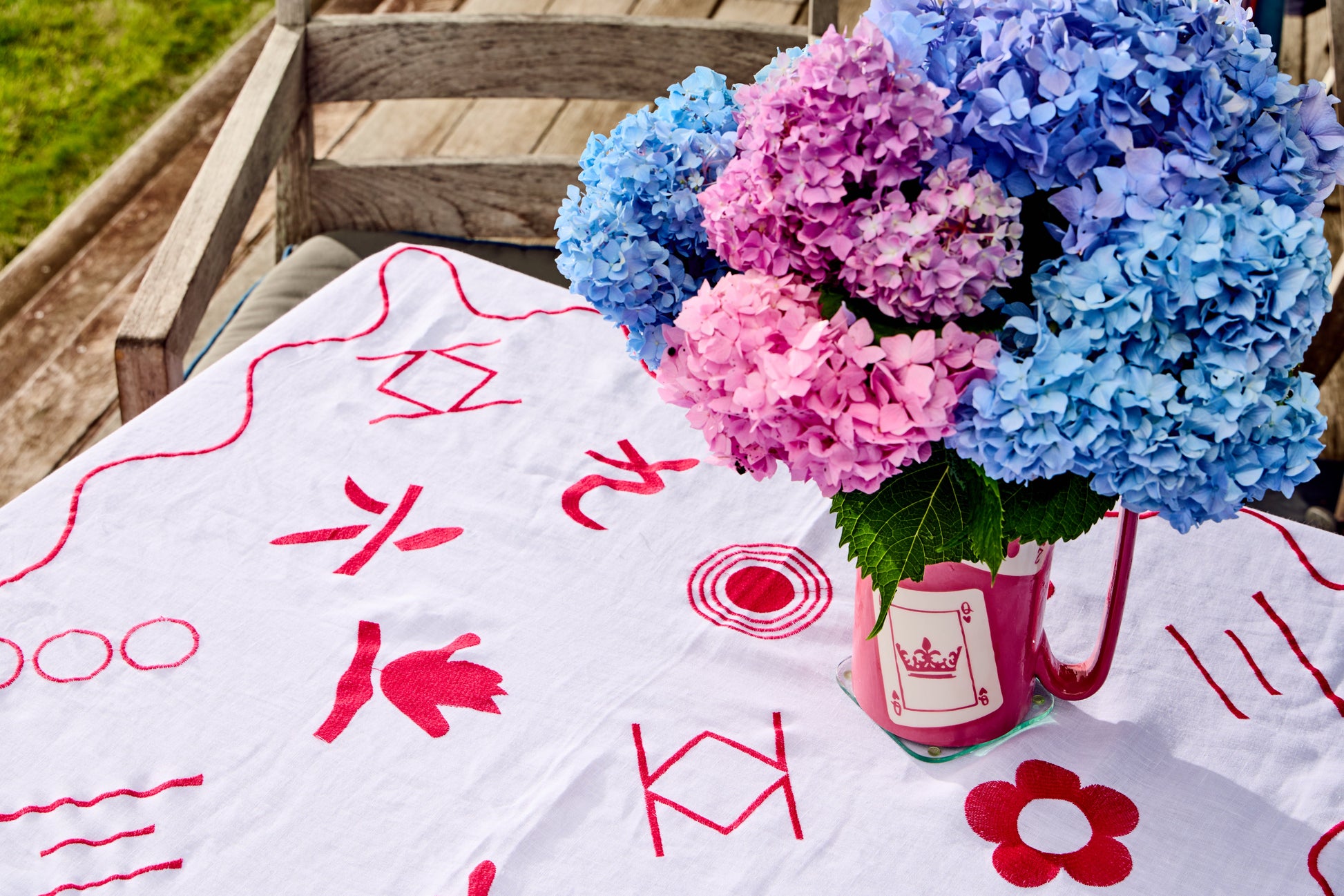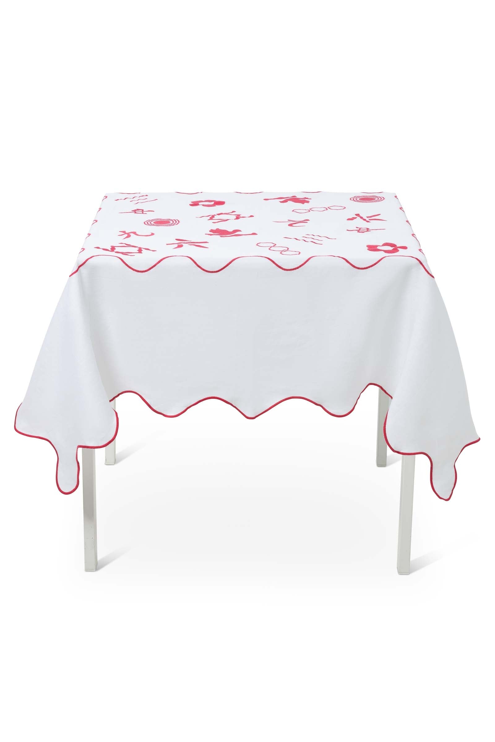 Up your game with our playful yet elegant mahjong-inspired tablecloths! Each tablecloth is made in Portugal with 100% linen and features modern mahjong symbols embroidered on the surface. Our luxury linen tablecloths are 150cm x 150cm with a scalloped border and will fit most card tables.